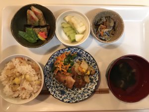 栗のちらし寿司、サンマの煮付、鶏の照り焼き、ゆず春雨、カニカマ磯辺天、インゲンの錦糸合え、フルーツ盛り合わせ(キウイ&リンゴ)、すまし汁