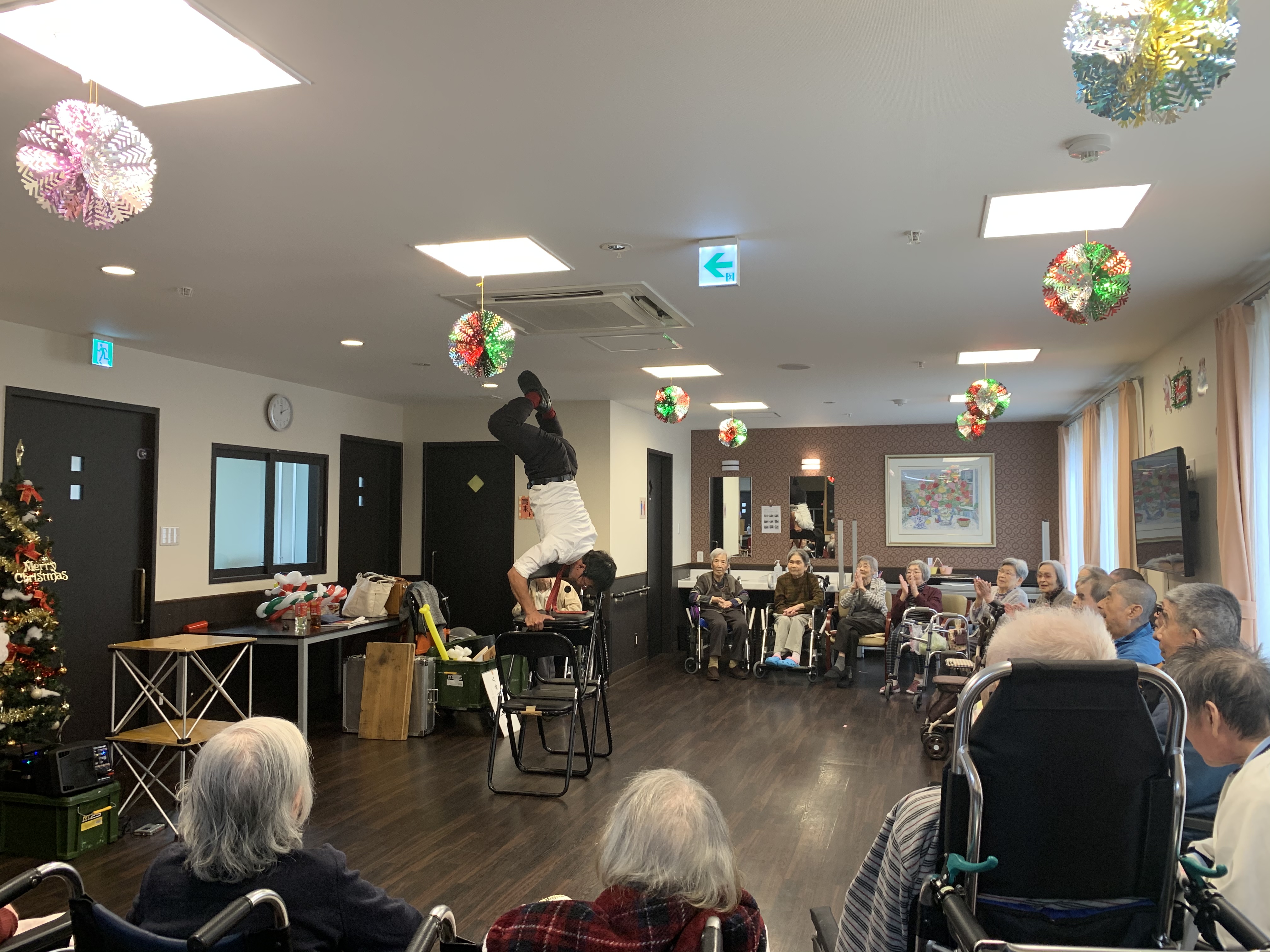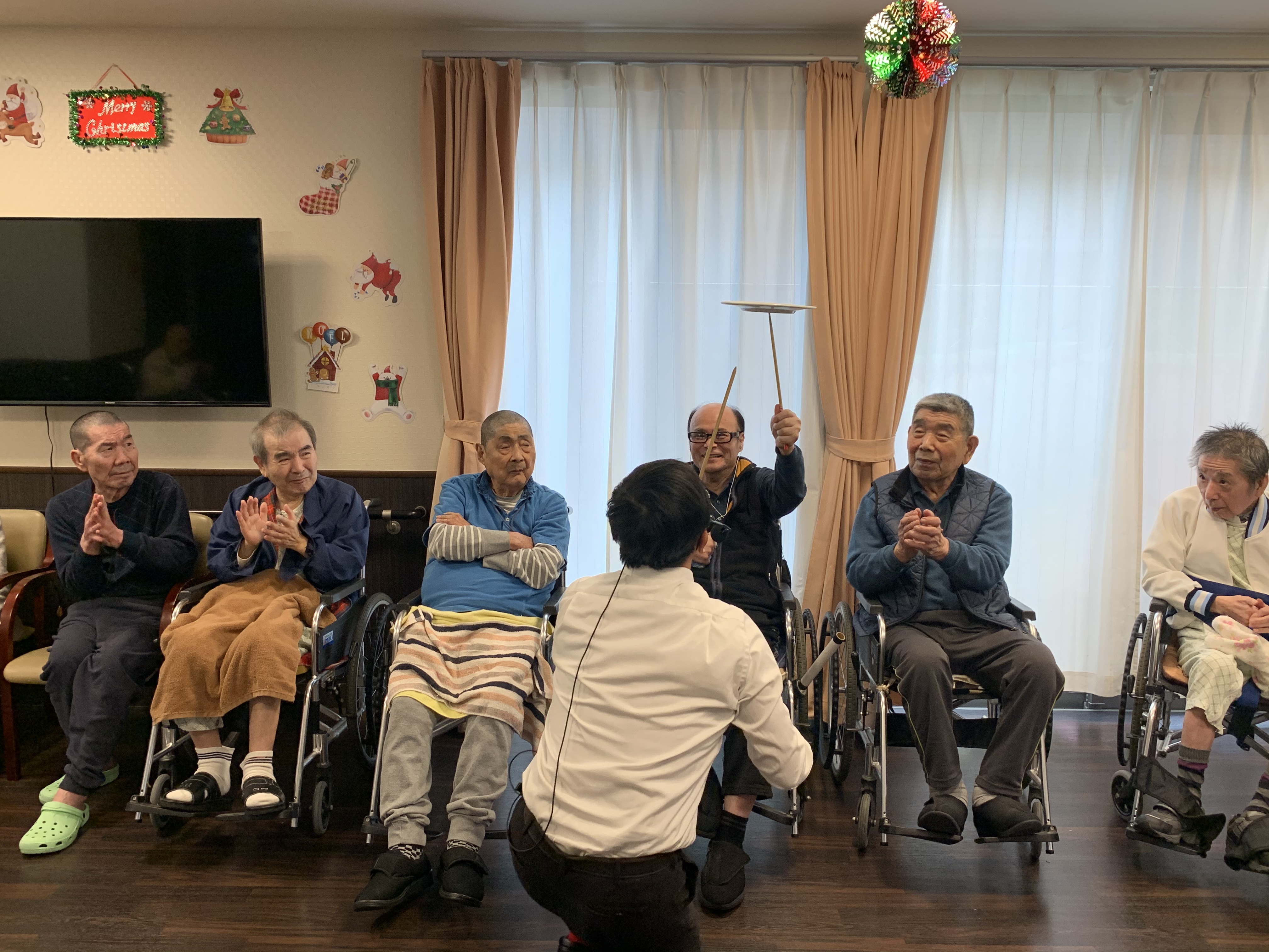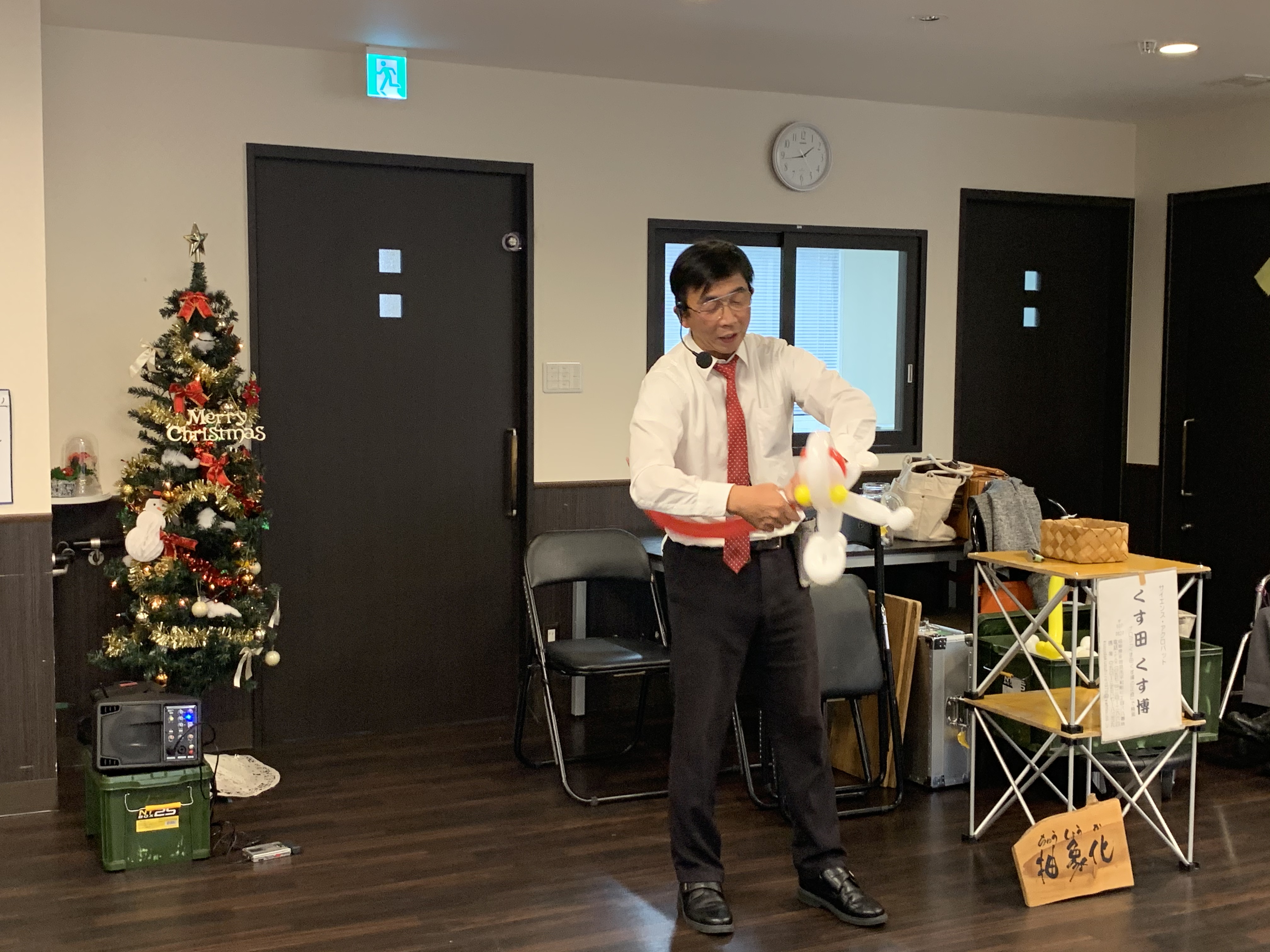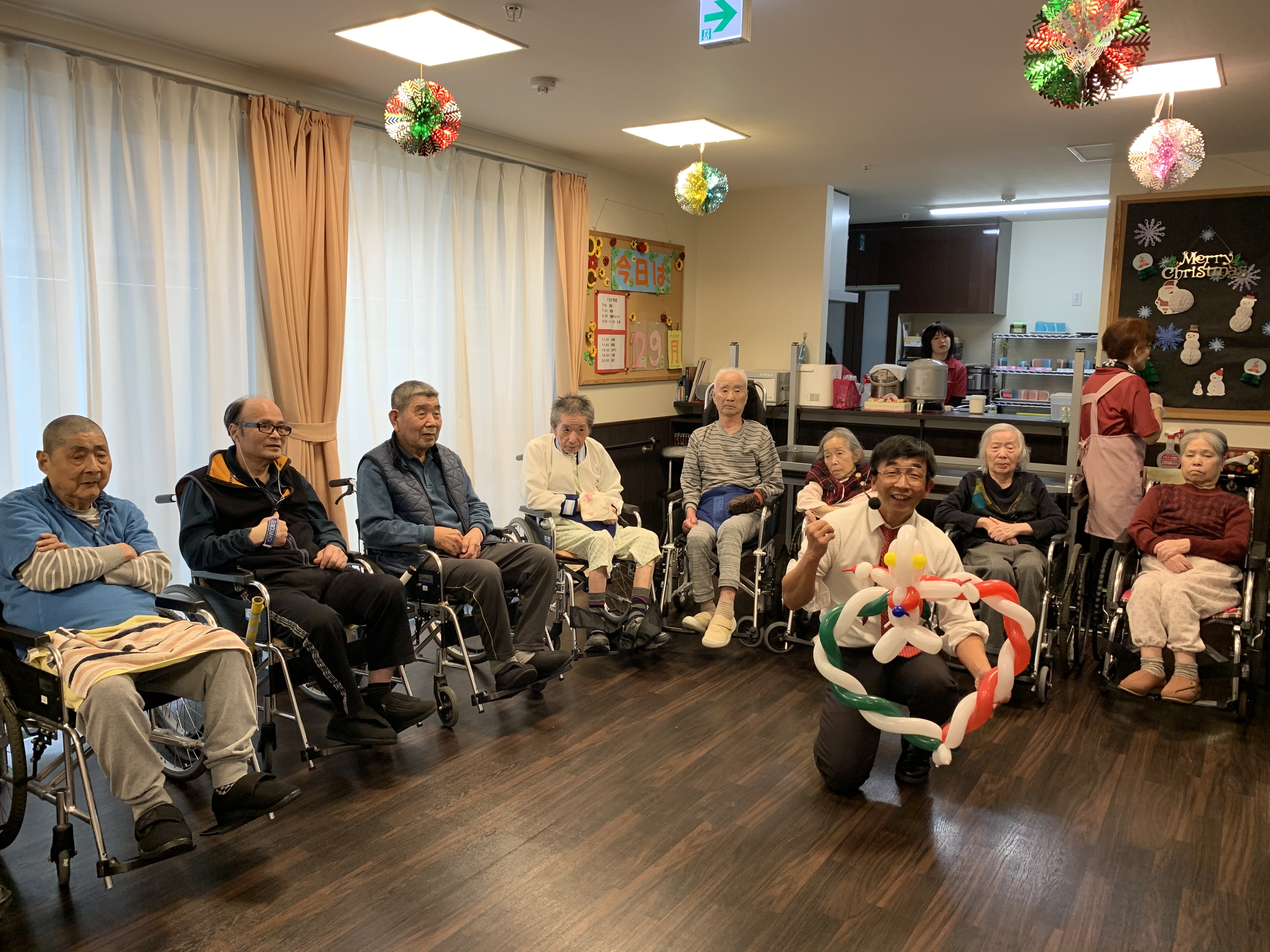 スタッフブログ 植田 🐩大道芸🐩エルステージ植田🎈 2019年12月9日 今日は プロ大道芸人【くす田くす博さん】による 大迫力の大道芸パフォーマンスが 開催されました🦒🐩 風船を膨らませて 素敵なものを作って下さいました☆*° ご利用者様も 大道芸に挑戦!!見事お皿が回りました( ¨̮ ) 椅子の上での逆立ち!! 凄かったです!! 拍手沢山響いてました👏👏( ˊᵕˋ*) そして最後には記念撮影して頂きました✩.*˚ ハラハラドキドキの 大道芸パフォーマンス! ありがとうございました( ¨̮ ) エルステージ植田( ¨̮ )