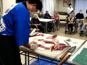 名東 特大鰤の解体ショー エルステージ名東 2020年12月21日 こんにちはエルステージ名東です。 今が旬の特大鰤をご利用者様の前でライブで解体して 豪華な海鮮丼にして、食べて頂きました。 ご利用者様に日常では味わえない感覚を体験して頂きました。 マグロもさばける大きな包丁と 短冊状の切り身をさばく時の包丁を使い分け 食べやすい大きさにさばいてくださいました。 旬の鰤を最高の鮮度でご利用者様に食べていただきました。