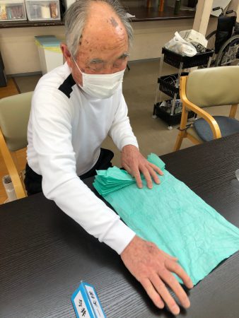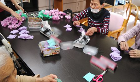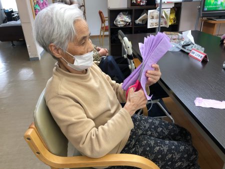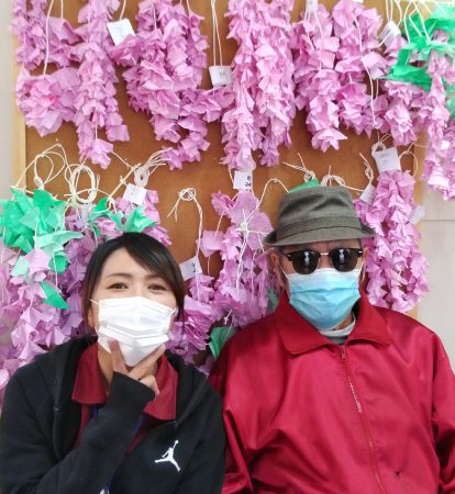 風の丘 風の丘リハビリセンターリハビリ風景 2021年4月16日 平行棒にて歩行訓練をしています。 下肢筋力強化、つまずき予防の歩行訓練等 平行棒を利用して個別機能訓練にあたっています。 機能訓練士が、一対一で利用者様と取り組むので集団体操とは違った信頼感を持っていただけます。 利用者様と藤の花を制作しました。 一枚一枚手作りしています。 玄関に皆様の作品を展示しました。