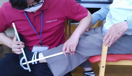 風の丘 風の丘リハビリセンター 2021年6月15日 リハビリに力をいれて活動しております その様子を少しご紹介します 利用者様の室内外での活動が滞りなく していただけるよう下肢筋力強化や つまずき予防に取り組んでいます。 つまずき予防のための足関節可動域を広げるストレッチをしているところです。 足関節の可動域を計測しています。
