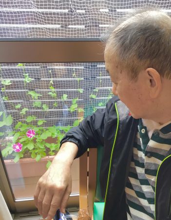 小田井 エルステージ小田井 花便り 2021年7月16日 こんにちは 連日のゲリラ豪雨 怖いですね😣 そんな天候にも負けず タネから育てた アサガオが開花しました🎶 施設フロア南側にデッキがあり フロアから外に出る事無く、眺められるように工夫しました👍 入居者様が少しでも季節を感じて頂けたらと思います💕