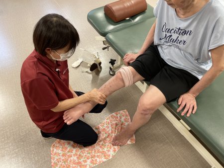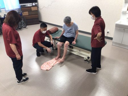 スタッフブログ 豊田 エルステージ豊田 リハビリ風景💪 2021年9月12日 N様のリハビリ風景です。N様は右下腿部の浮腫が強く足首の関節も拘縮している状況です🥺 そこで本日は下腿部の浮腫取り、関節拘縮の予防.改善を機能訓練士が介護スタッフに実技も行いながら勉強会を行いました👍 N様に自分1人で行えるタオルを使ったリハビリもお伝えしました😊 最初は『難しい』とおっしゃってみえましたが徐々にコツを掴まれていました💪 N様これからも一緒に出来るリハビリをコツコツ続けて行きましょう🤗