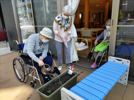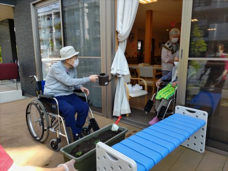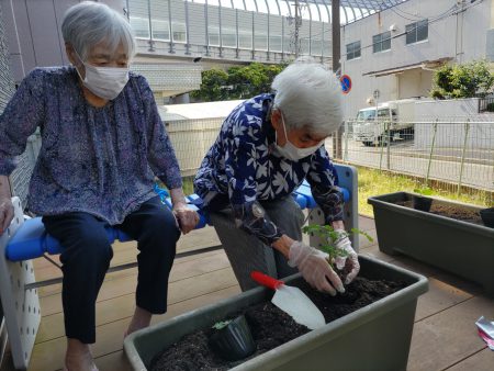スタッフブログ 名東 プランターで育てよう🌱エルステージ名東 2022年6月5日 先日、マリーゴールド・トマト・ゴーヤの苗を頂いたので、苗を利用者様に植えて頂きました。 昔は、畑仕事したのよ~✨ 花はよく育ててた〜✨ 花があると嬉しいと話されていました😍 野菜の収穫も楽しみにしてます😊 エルステージ名東では、スタッフも利用者様も庭いじりが好きな方が沢山いらっしゃるので、畑を作りたいと考え中。 コロナでなかなか外に出れないので、敷地内での楽しみを増やしたいと思っています。 エルステージ名東