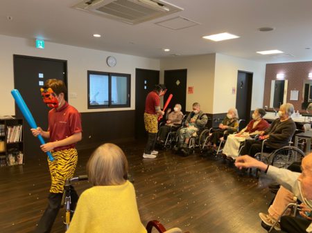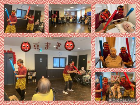 スタッフブログ 植田 👹エルステージ植田👹 2023年2月6日 2月3日 節分👹 エルステージ植田に親子鬼が登場しました👹 仲良し親子鬼👹 ご利用者様は沢山豆を巻き鬼退治👹 鬼退治をするはずが、ご利用者様と親子鬼は仲良しになりました😊 親子鬼と記念撮影会📷✨ 優しいご利用者様が沢山ですね😊 おやつは可愛い鬼の饅頭と甘納豆👹🍵 沢山の福が届きますように😊 👹エルステージ植田👹