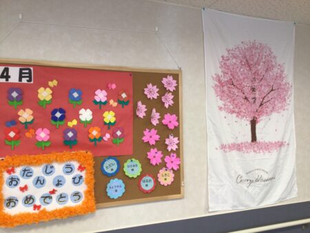 スタッフブログ 豊田 エルステージ豊田 4月飾り🌸🎶✨ 2023年4月7日 こんにちは😃エルステージ豊田です🤗 4月の施設内の飾りをご紹介します❗️✨ 4月は桜シーズンなので桜の飾りが多いです🌸🌸🌸 向かいの公園の桜もキレイに咲いています🌸 利用者の皆さんからもキレイだね✨と春を感じてもらっています🤗✨ エルステージ豊田