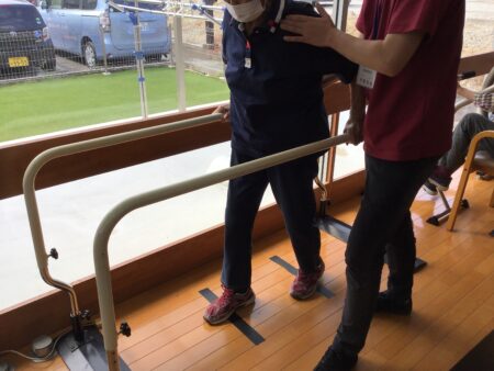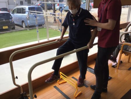 風の丘 風の丘リハビリセンター運動風景 2023年9月22日 こんにちは、風の丘リハビリセンターです。 本日は、平行棒で歩行訓練を行いました。 最初は、歩く時に前傾姿勢になってしまい、足も上がっていませんでした。 姿勢を意識して繰り返し行う事で、少しずつ歩行姿勢が良くなってきました。 又、ハードルを使い足を上げる訓練も行いました。 最後は、良い姿勢で足を上げる事ができました。 今後も歩行改善の為に、継続して行っていきたいと思います。