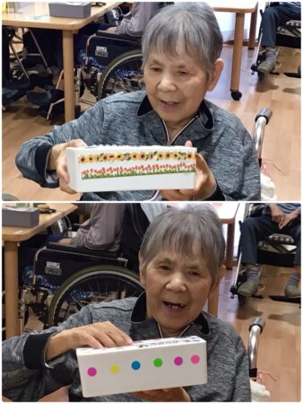 スタッフブログ 小田井 オリジナルティッシュケース作り 2023年10月5日 先日、敬老の日に送らせて頂いた記念品のティッシュケースを皆様のオリジナルを加えて世界にひとつだけの装飾ケースにして頂きました✨✨ 皆様、楽しみながらも、一生懸命でした❣️ そして、完成した時の笑顔が素敵でした✨✨✨✨ 以上エルステージ小田井でした🍁