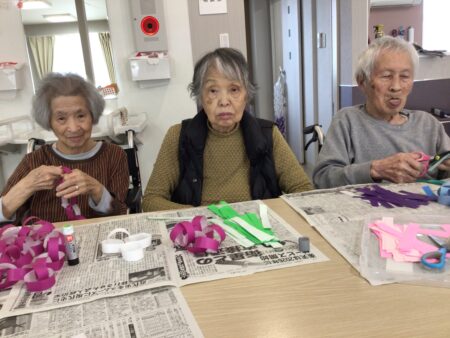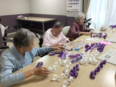 スタッフブログ 岩倉 藤の花、完成にむけて^ ^ 2024年4月29日 こんにちは、エルステージ岩倉です。 只今、利用者様と職員の共同作業で藤の花を製作中です。 折り紙をハサミで短冊状に切り、輪っかにして繋げていきます。 「これは何個繋げるの?」「上手くできんわー」「楽しみだね」と、 会話を弾ませながらも、視線の先はしっかり手元を見て作業を進めていらっしゃいました。 完成まであともう一歩、完成が楽しみです。 以上、エルステージ岩倉でした。