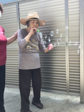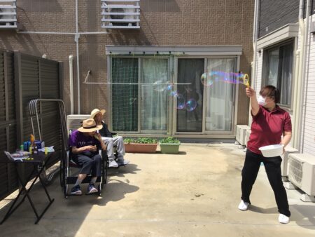スタッフブログ 岩倉 シャボン玉レク★エルステージ岩倉 2024年6月17日 こんにちはエルステージ岩倉です。 梅雨入り前の天気がいい日にシャボン玉レクを行いました。 初めは上手く息が吹けなかった方も練習するうちに上手にシャボン玉が作れるようになりました。 皆さん楽しそうでたくさんの笑い声が聞かれました。 利用者様と楽しいひと時を過ごすことができました。 以上、エルステージ岩倉でした。
