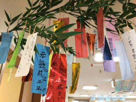 スタッフブログ 小田井 エルステージ小田井 七夕の飾り付けしました♪ 2024年7月6日 こんにちは、エルステージ小田井です。 入居者様とスタッフで、短冊に願い事を書いて 笹に飾りました🎋 皆様の願いが叶いますように✨