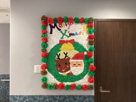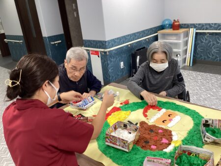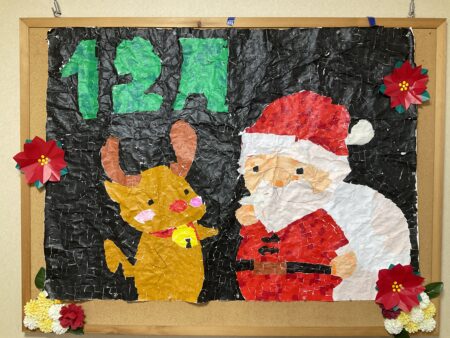 スタッフブログ 豊田月見 12月といえば・・・🎅🏻🎄 2025年12月3日 豊田月見では、クリスマスに向けて みなさんと一緒に貼り絵づくりを行いました! 貼り絵は、ただ紙を貼るだけではなく ちり紙を一つひとつ丁寧にちぎり 色の部分に貼り付けていくという手間をかけることで より色鮮やかで温かみのある作品に仕上がっています🎨🌈 お一人おひとりが心を込めて協力しながら作った 貼り絵は、館内のいろいろな場所に飾られています🎀 完成した作品はこちら😸⭐ ふと目に入るカラフルな作品で気分があがります! エルステージ豊田月見